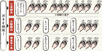 宴会などで行われる手締め。全国的に知られるのが「三本締め」です。手拍子9回が漢字の「九」、最後の手拍子1回で「丸」となり、「丸く収まりました」となります。一番有名ですね。